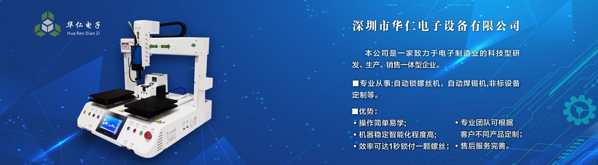 深圳市華仁電子設備有限公司是一家致力于電子制造業周邊設備的科技型研發、生產、銷售一體的企業,專業從事:自動鎖螺絲機;自動焊錫機;非標設備定制機等,公司長期以來在行業中積累了豐富的經驗,擁有專業的研發、技術、銷售支持工程團隊、各高級技術人才為客戶提供優質產品和服務,同時不斷吸取國內外先進技術,更準確及時地為客戶提供優質,性價比高的產品、公司以專業的售前、售中、售后服務贏得了客戶的信賴和好評,為客戶提供先進自動化設備一體式解決方案、